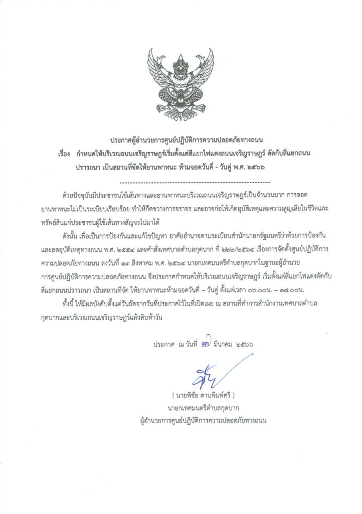 ประกาศผู้อำนวยการศูนย์ปฏิบัติการความปลอดภัยทางถนน เรื่อง กำหนดให้บริเวณถนนเจริญราษฎร์เริ่มตั้งแต่สี่แยกไฟแดงถนนเจริญราษฎร์ ตัดกับสี่แยกถนนปรารถนา เป็นสถานที่จัดให้ยานพาหนะห้ามจอดวันที่ – วันคู่ พ.ศ. ๒๕๖๖